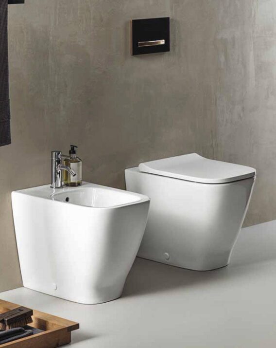Vaso senza brida di serie disponibile sia filo parete che sospeso, che garantisce massima igiene e grande facilità di pulizia